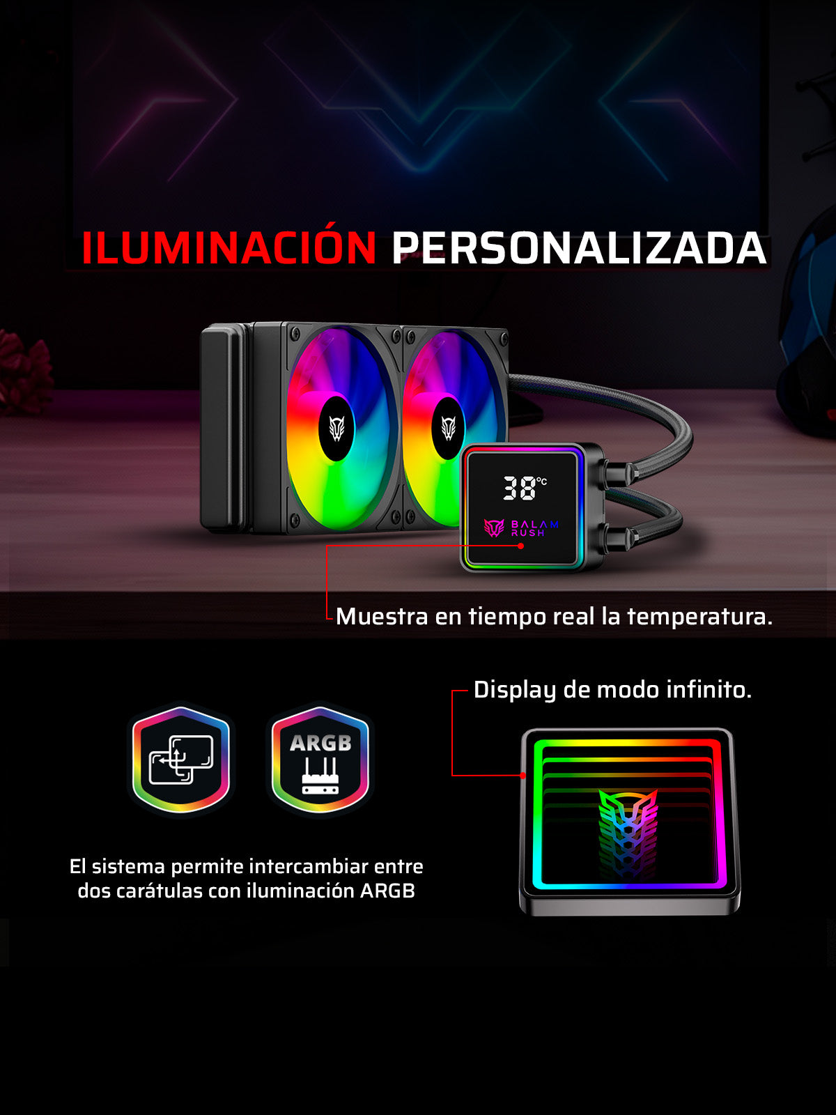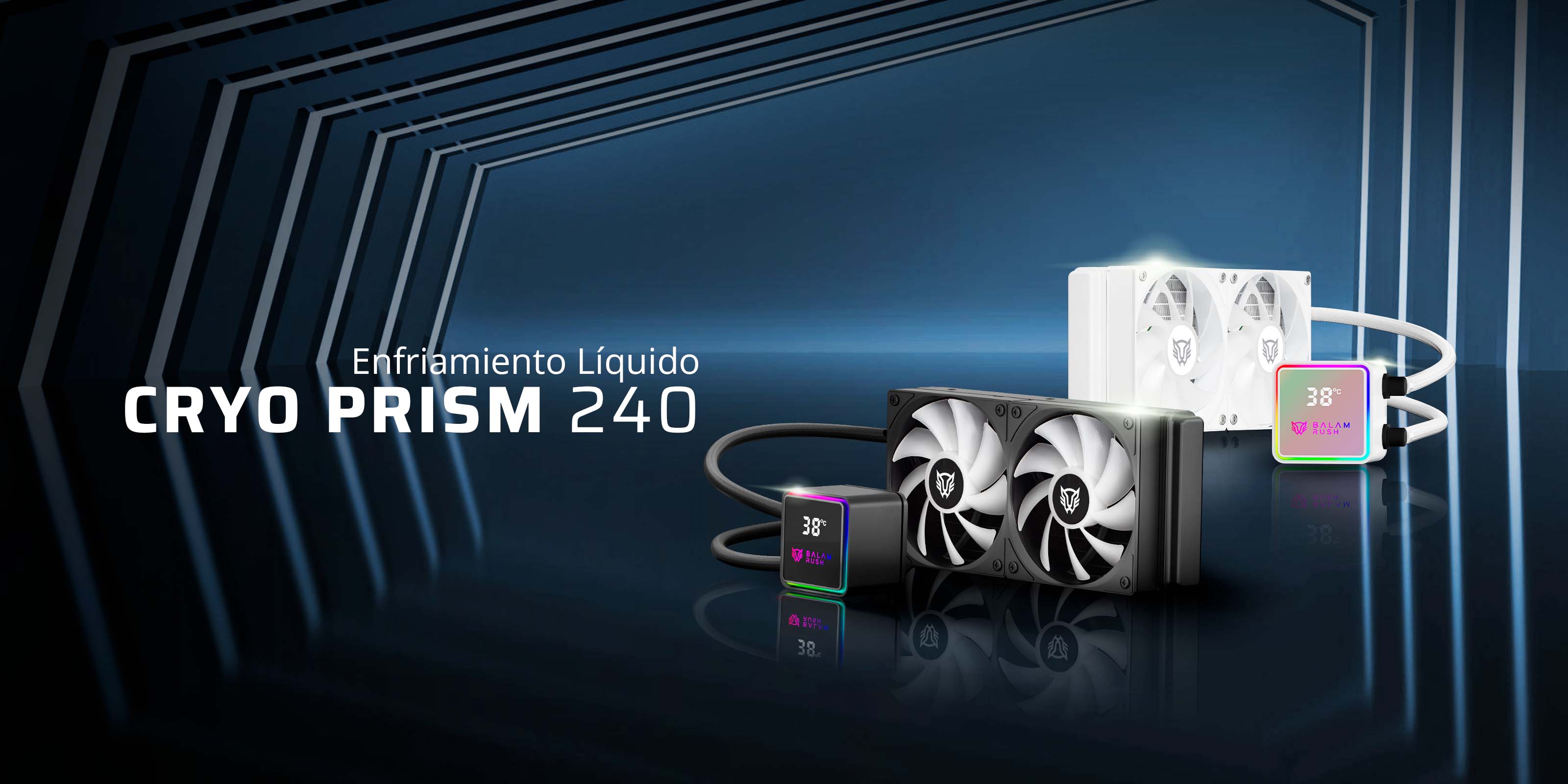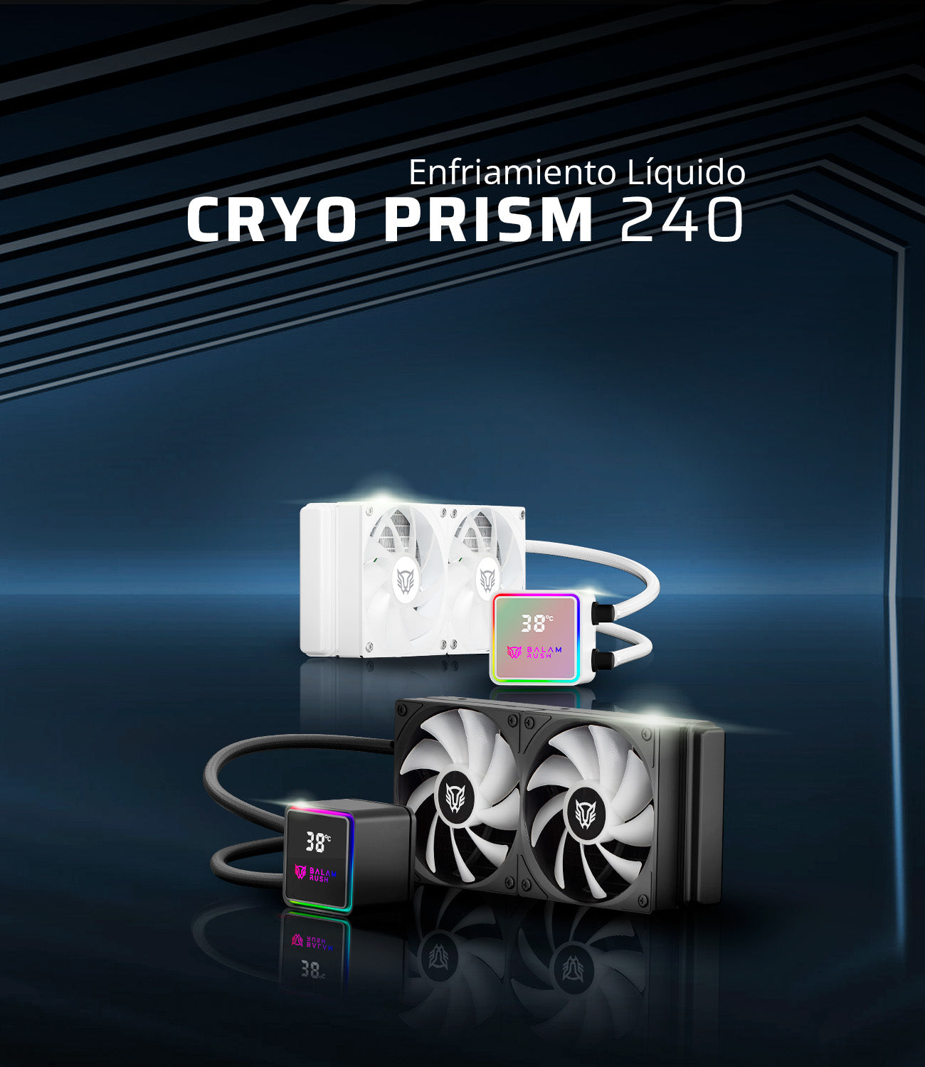 El Enfriamiento Líquido Cryo Prism 240 une potencia y estilo en un solo componente. Con una capacidad térmica de hasta 270 W, este AIO está diseñado para mantener bajo control incluso los procesadores más exigentes, ya sea en plataformas AMD o Intel. Su radiador de 240 mm proporciona una disipación eficiente, mientras que los ventiladores PWM garantizan un flujo de aire óptimo sin sacrificar silencio. Además, la bomba cuenta con iluminación ARGB y carátulas intercambiables, junto con un display de temperatura para que tengas monitoreo visual en tiempo real. Todo esto en un acabado negro elegante, ideal para builds de alto rendimiento con una estética moderna e impactante.