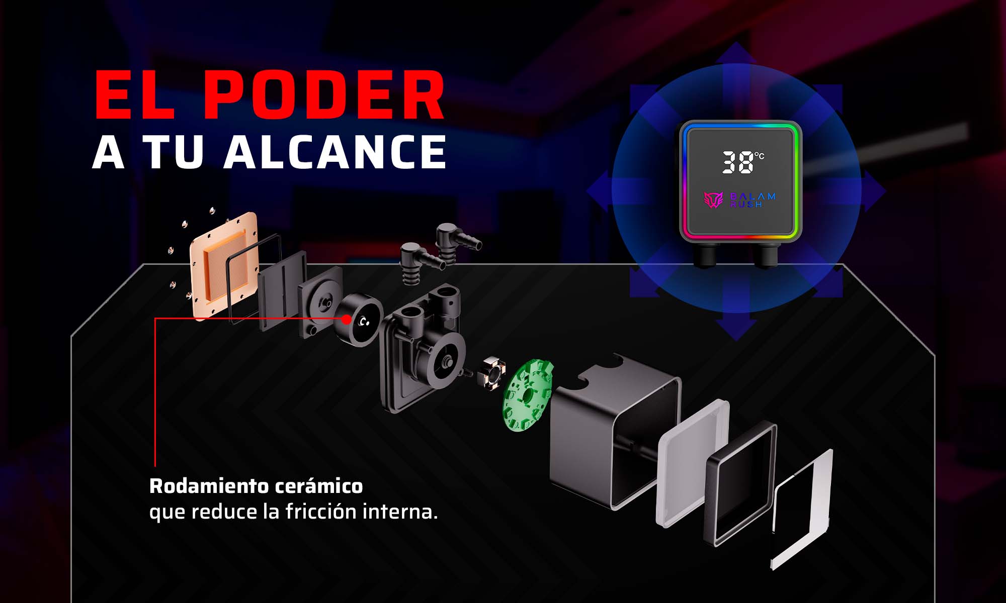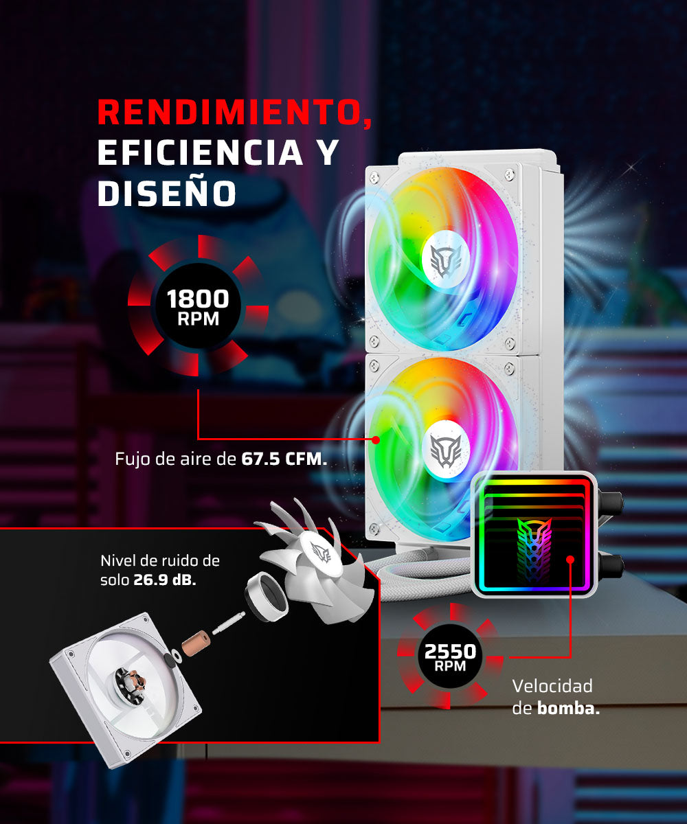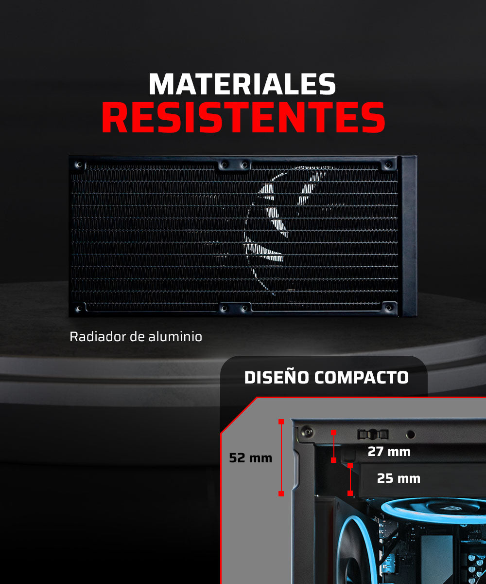 El radiador de aluminio, los ventiladores y la bomba trabajan en conjunto, garantizando enfriamiento eficiente, estabilidad térmica y desempeño confiable incluso bajo alta exigencia.