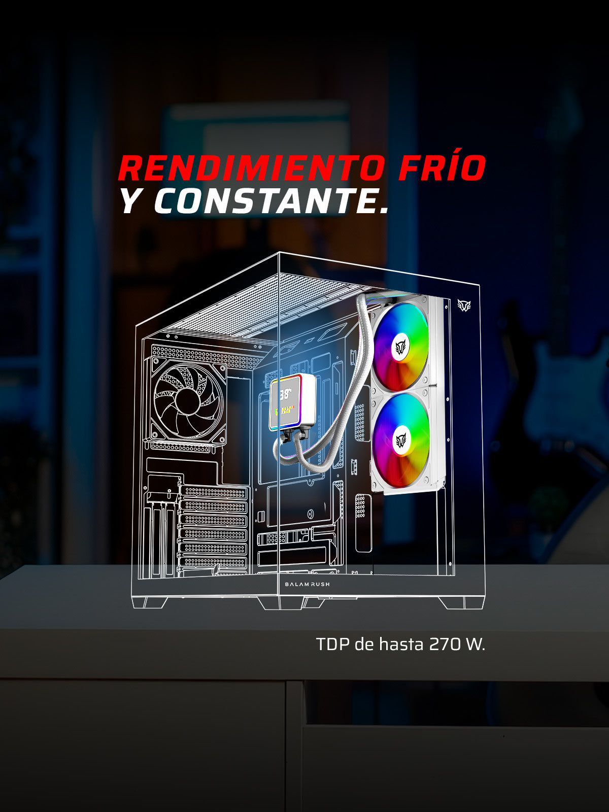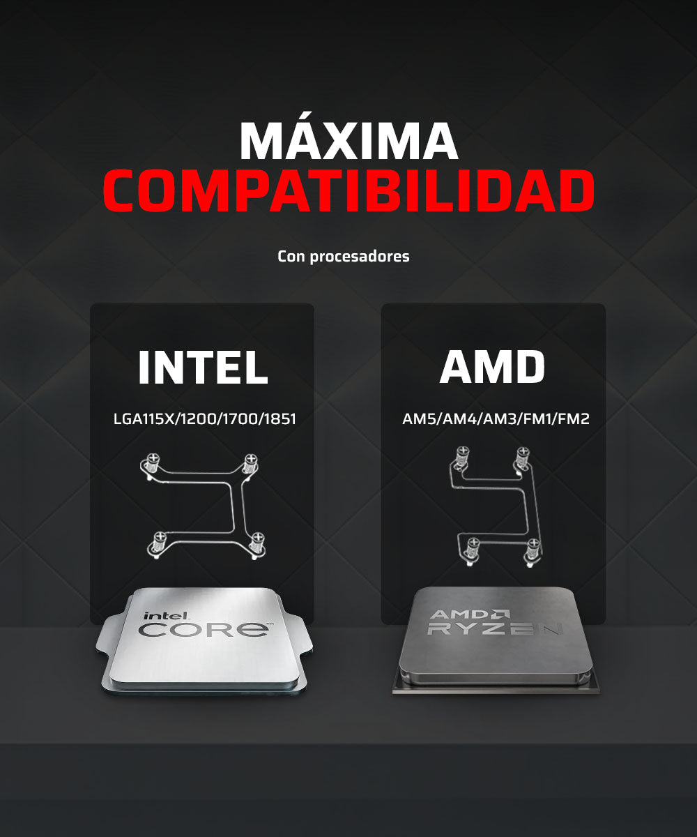 Compatible con procesadores Intel y AMD, el sistema garantiza instalación sencilla, amplia adaptabilidad y rendimiento óptimo en las principales plataformas gamer actuales.