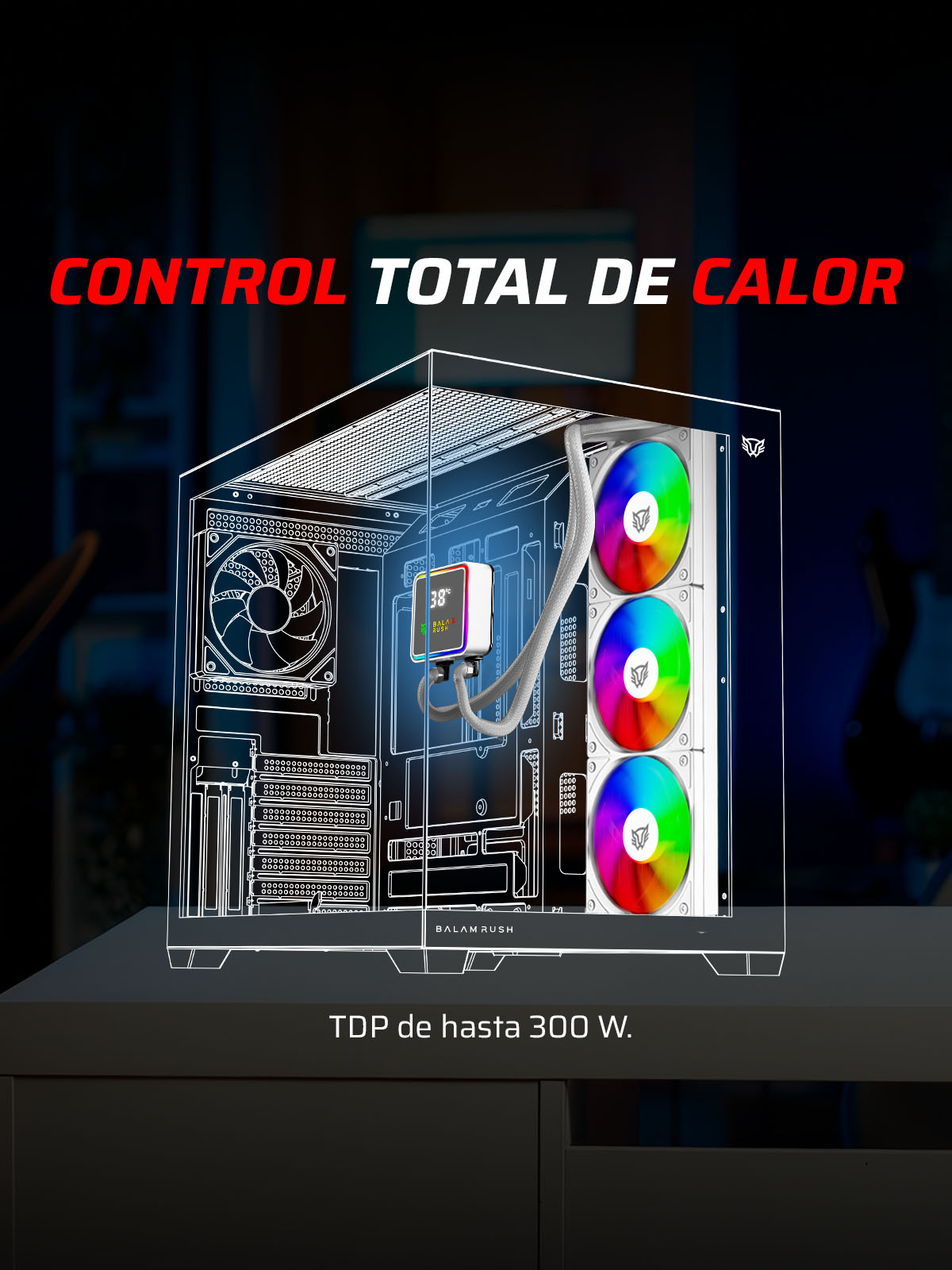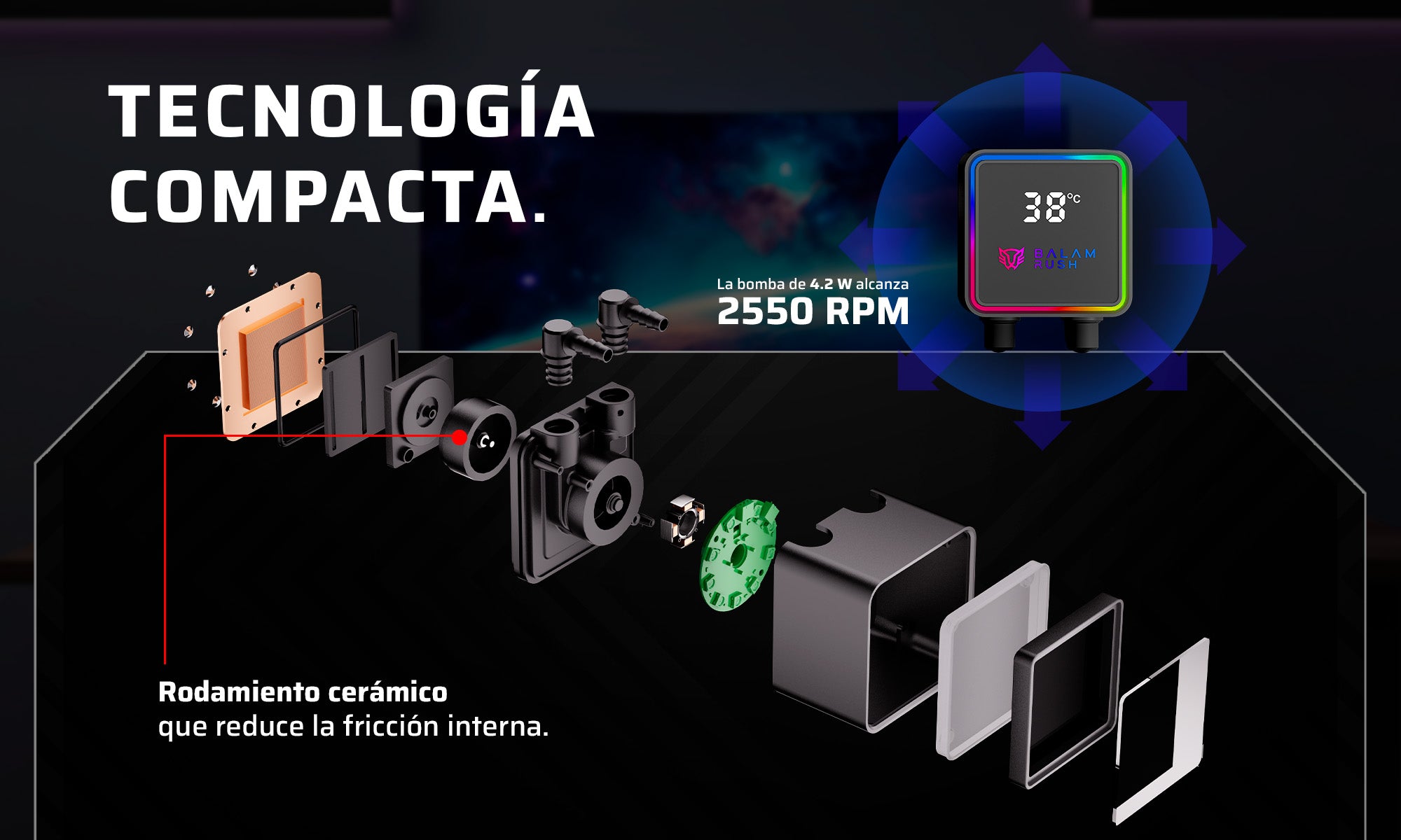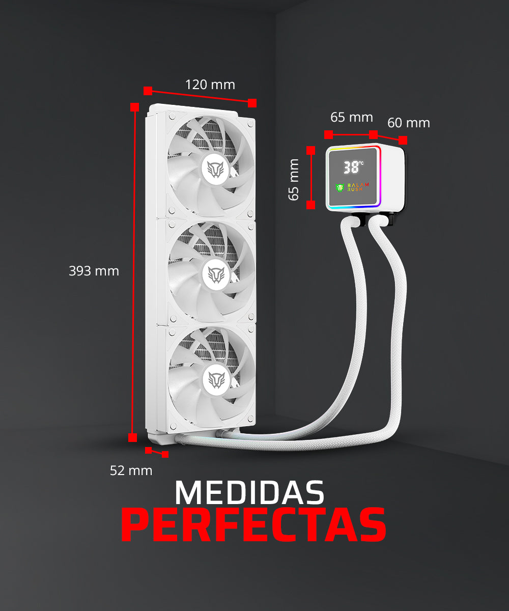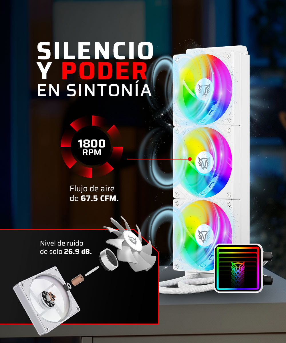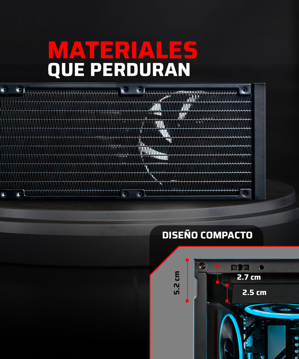 Radiador de aluminio, ventiladores y bomba trabajan en conjunto para un rendimiento estable.