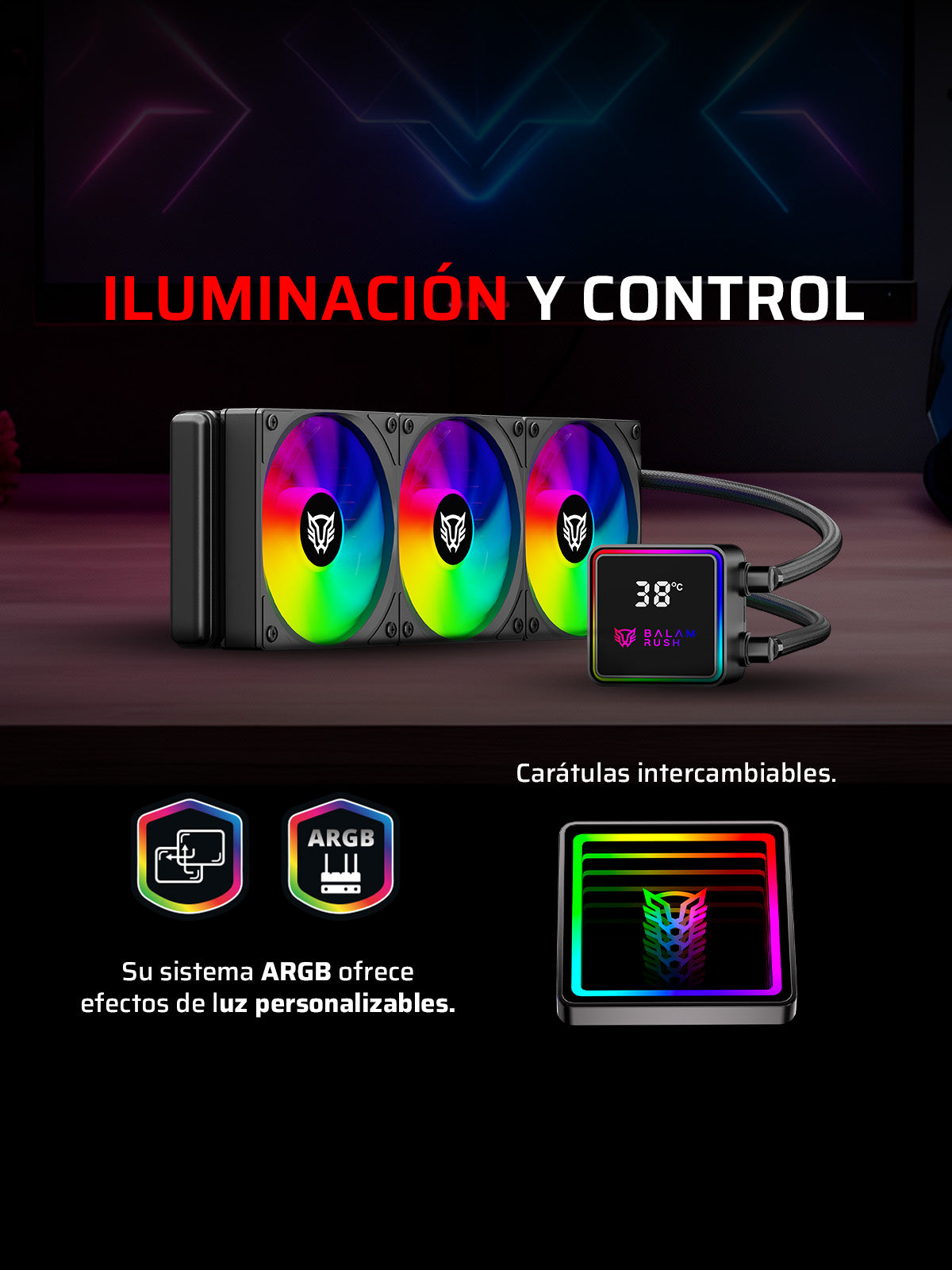 Su sistema ARGB brinda efectos personalizables y un display con modo infinito que destaca tu setup. Personaliza e intercambia las carátulas según tu estilo.
