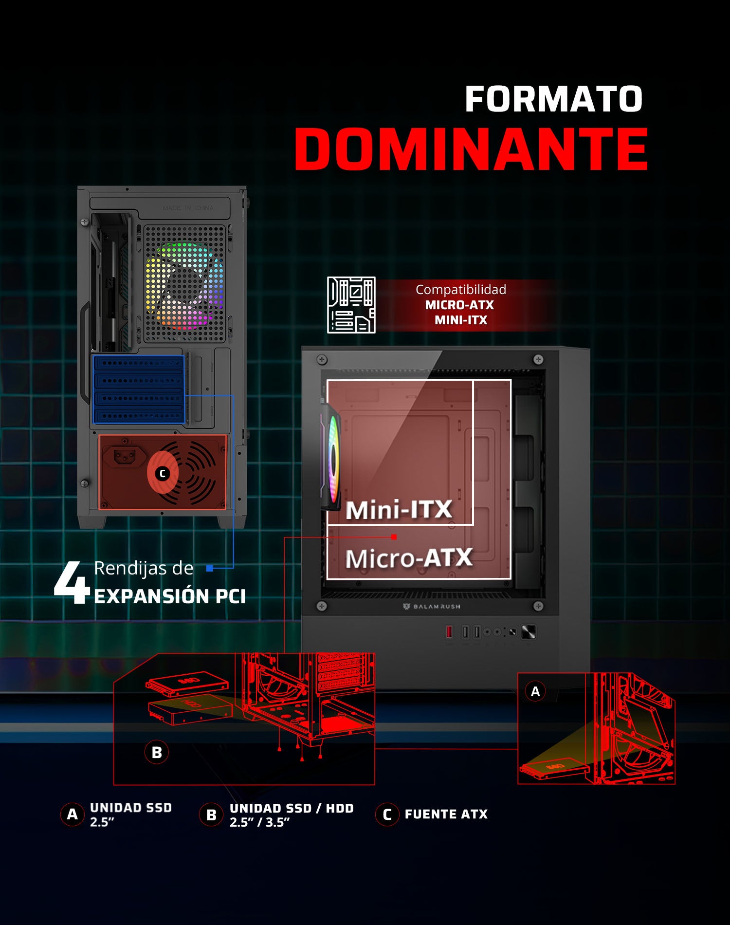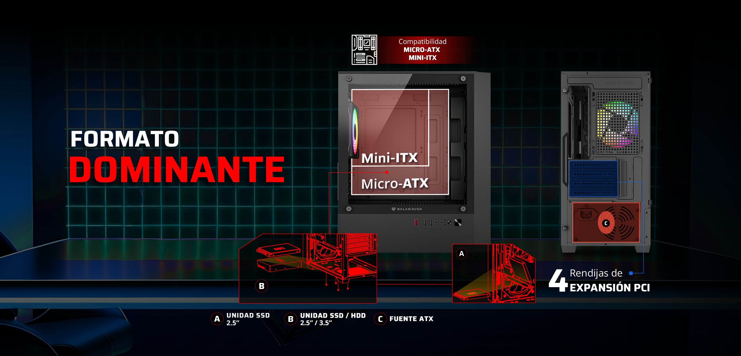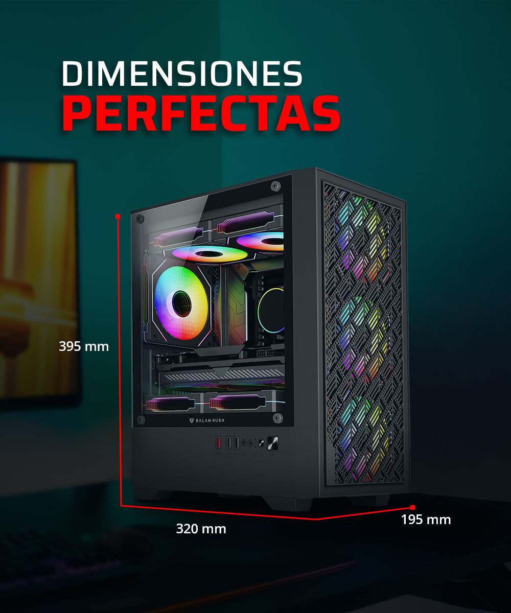 Compatible con motherboards Micro ATX y Mini ITX, ofrece la flexibilidad ideal para construir configuraciones gaming potentes, compactas y eficientes, manteniendo alto desempeño en cada partida y estilo visual moderno