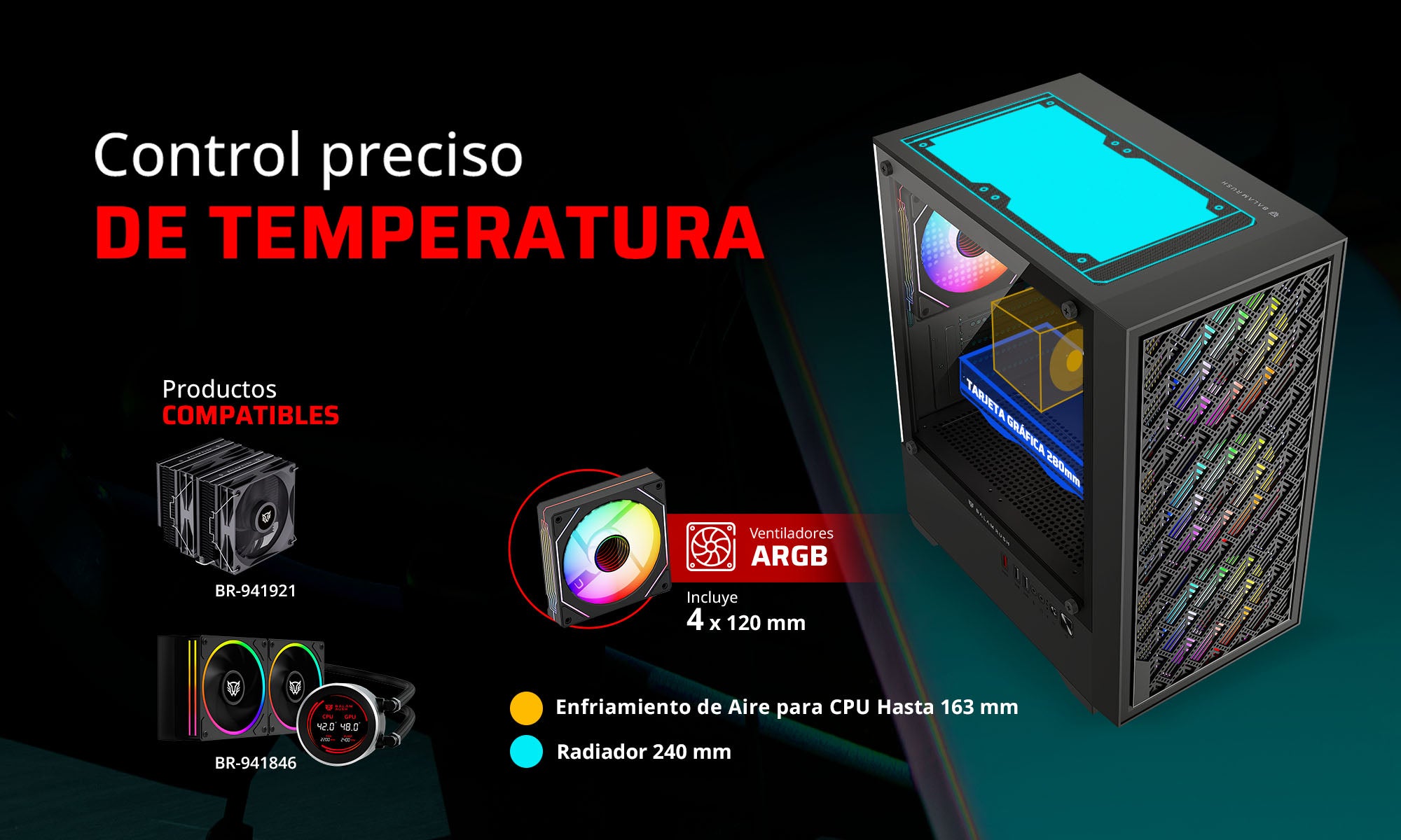 Asegurada y Bajo ControlSoporta hasta ocho ventiladores de 120 mm, radiador superior de 240 mm y trasero de 120 mm, y disipadores de aire de 163 mm, para que tu PC tenga estabilidad térmica durante largas sesiones de juego
