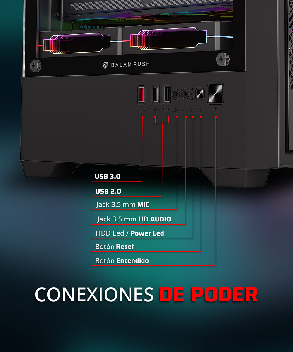 Incluye puertos USB 3.0, USB 2.0 y HD Audio y Mic de 3.5 mm, garantizando conexiones rápidas, versátiles y compatibles con diversos dispositivos y periféricos de entretenimiento"