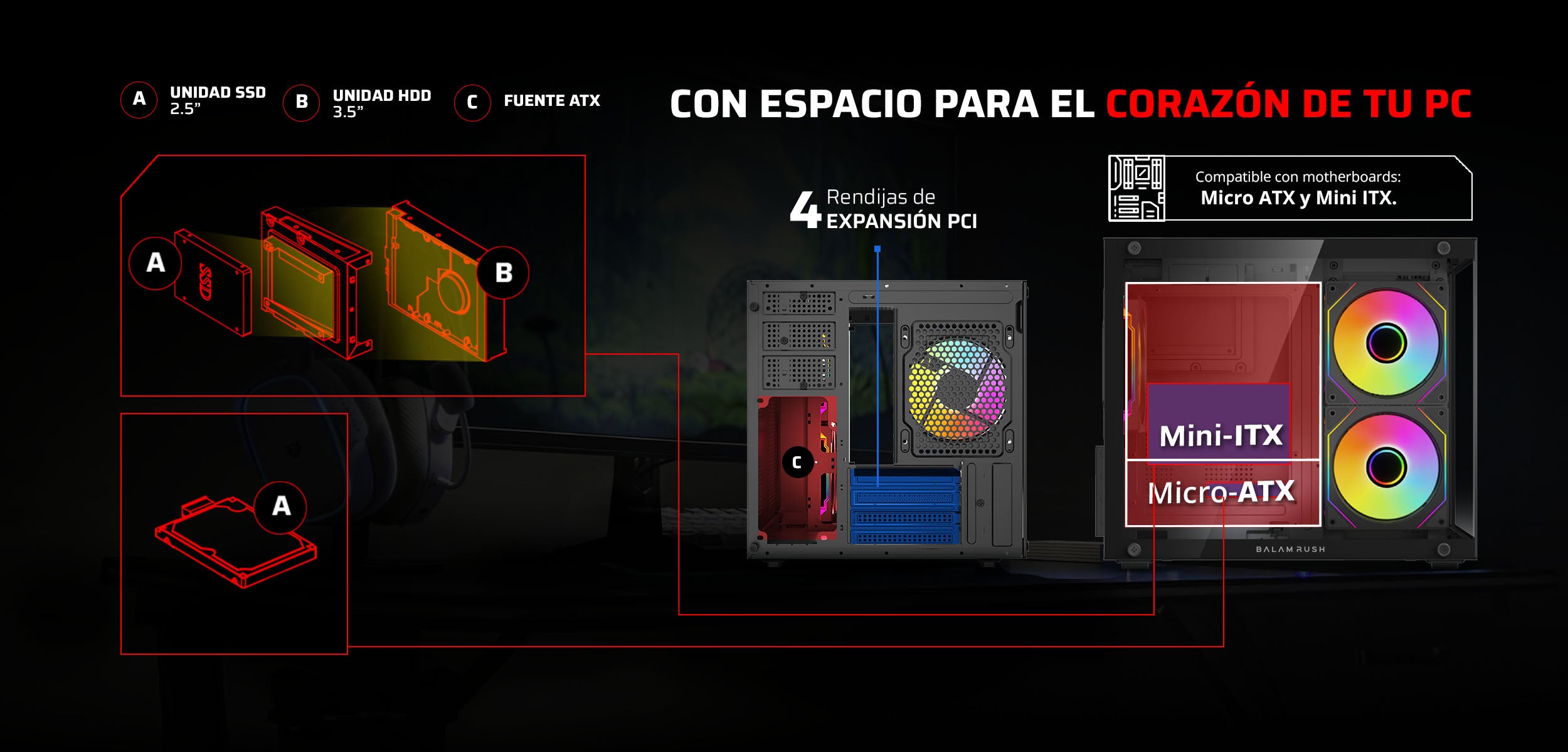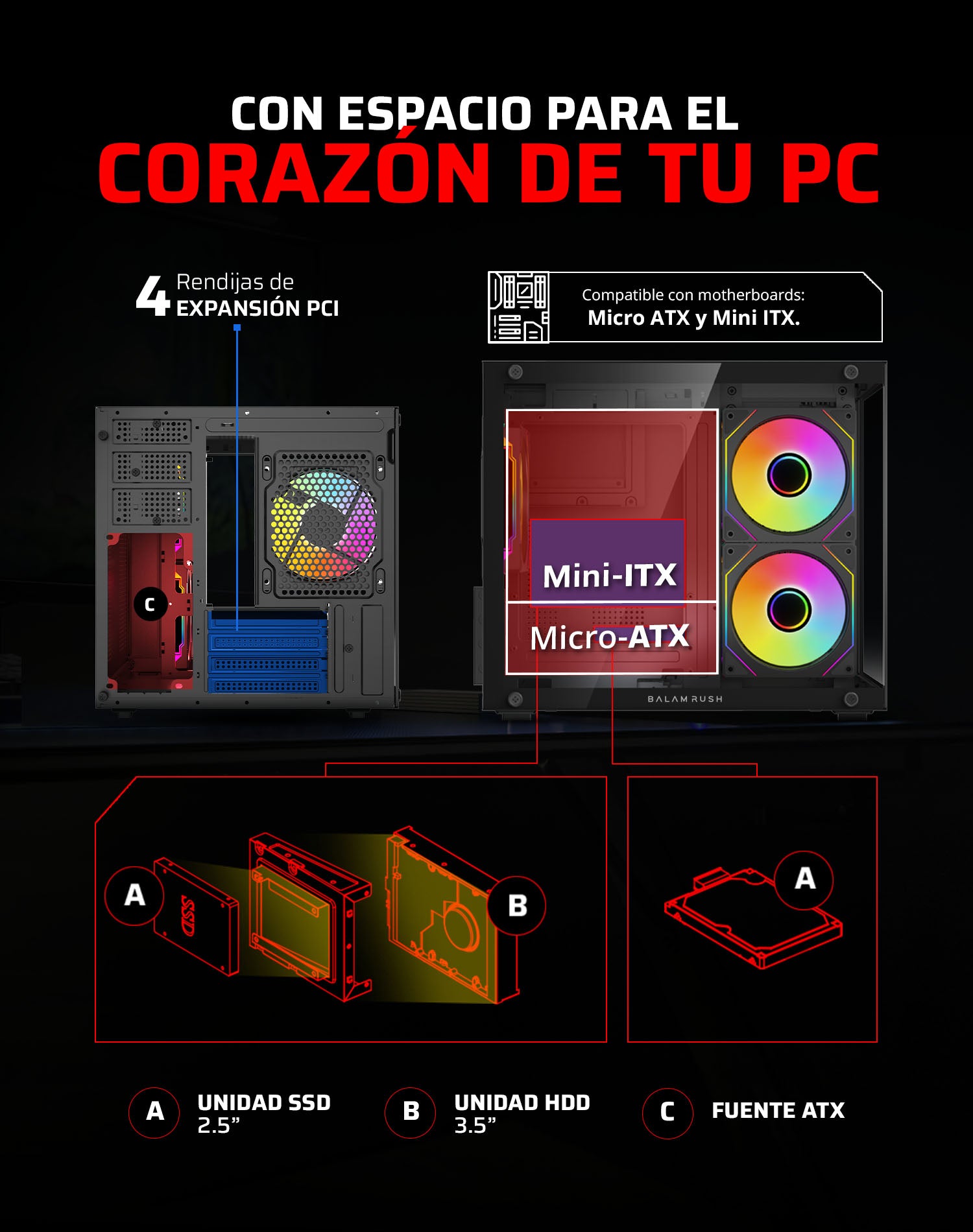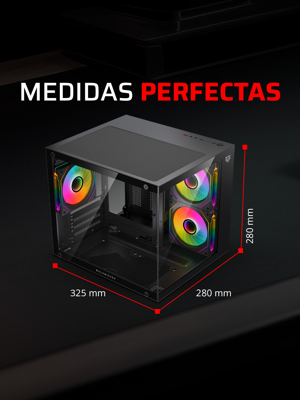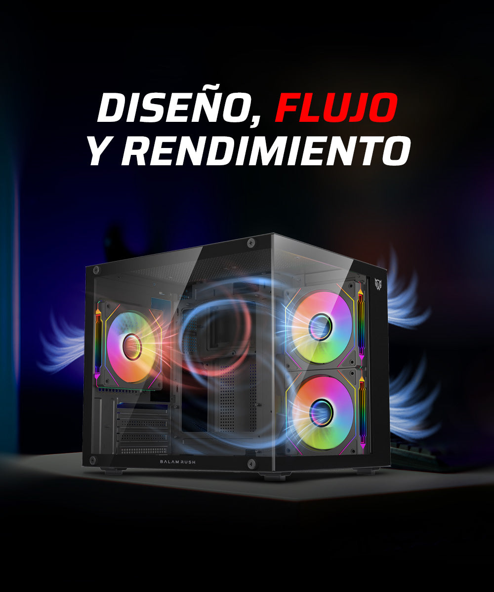 Compatible con motherboards Micro ATX y Mini ITX, ofrece la flexibilidad ideal para construir configuraciones gaming potentes, compactas y eficientes, manteniendo alto desempeño en cada partida y estilo visual moderno