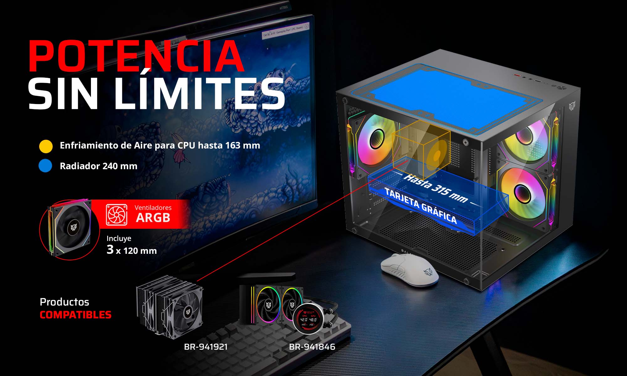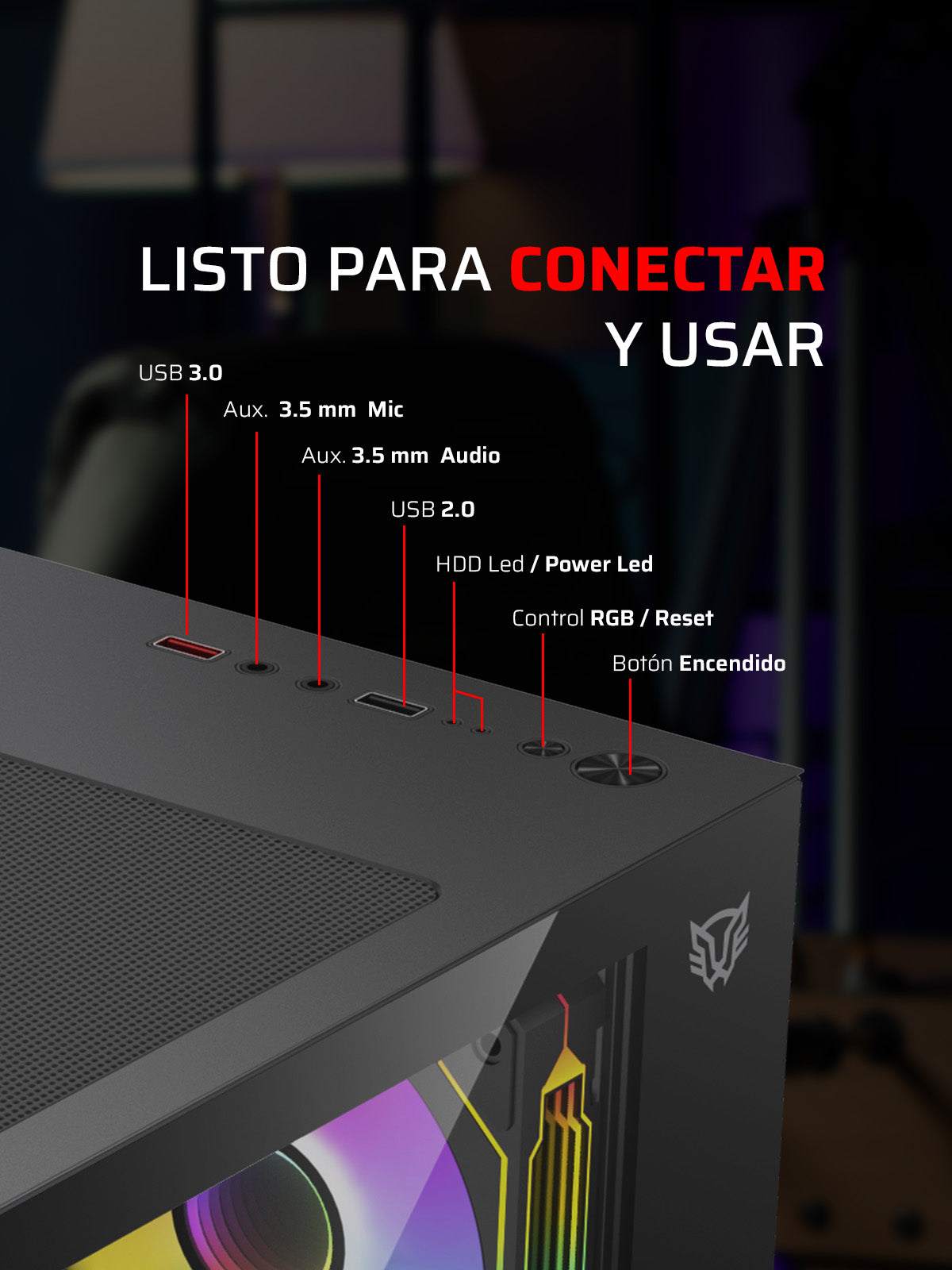 Combina estilo y rendimiento, ofreciendo iluminación impactante, flujo de aire superior y protección total para tus componentes durante las batallas más intensas.