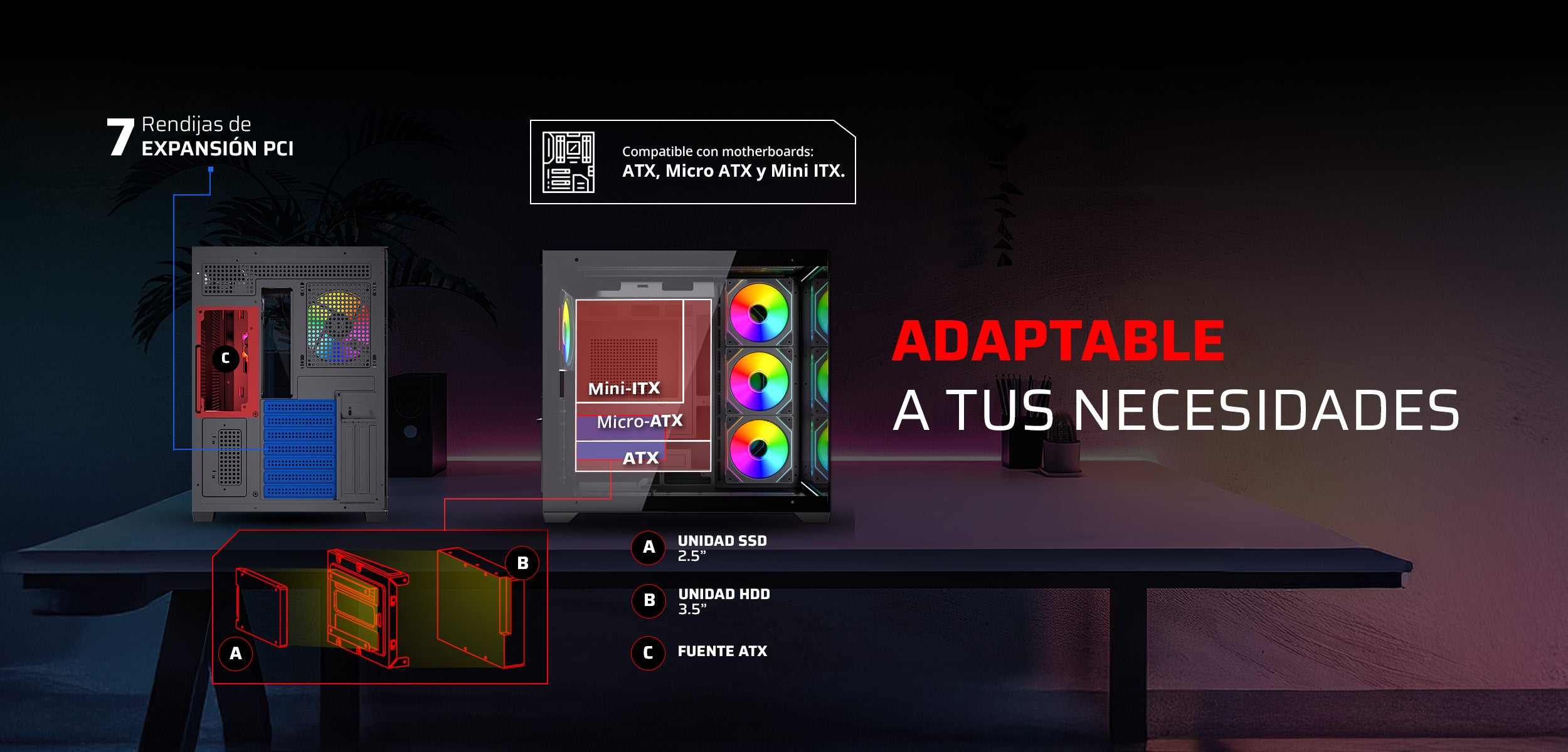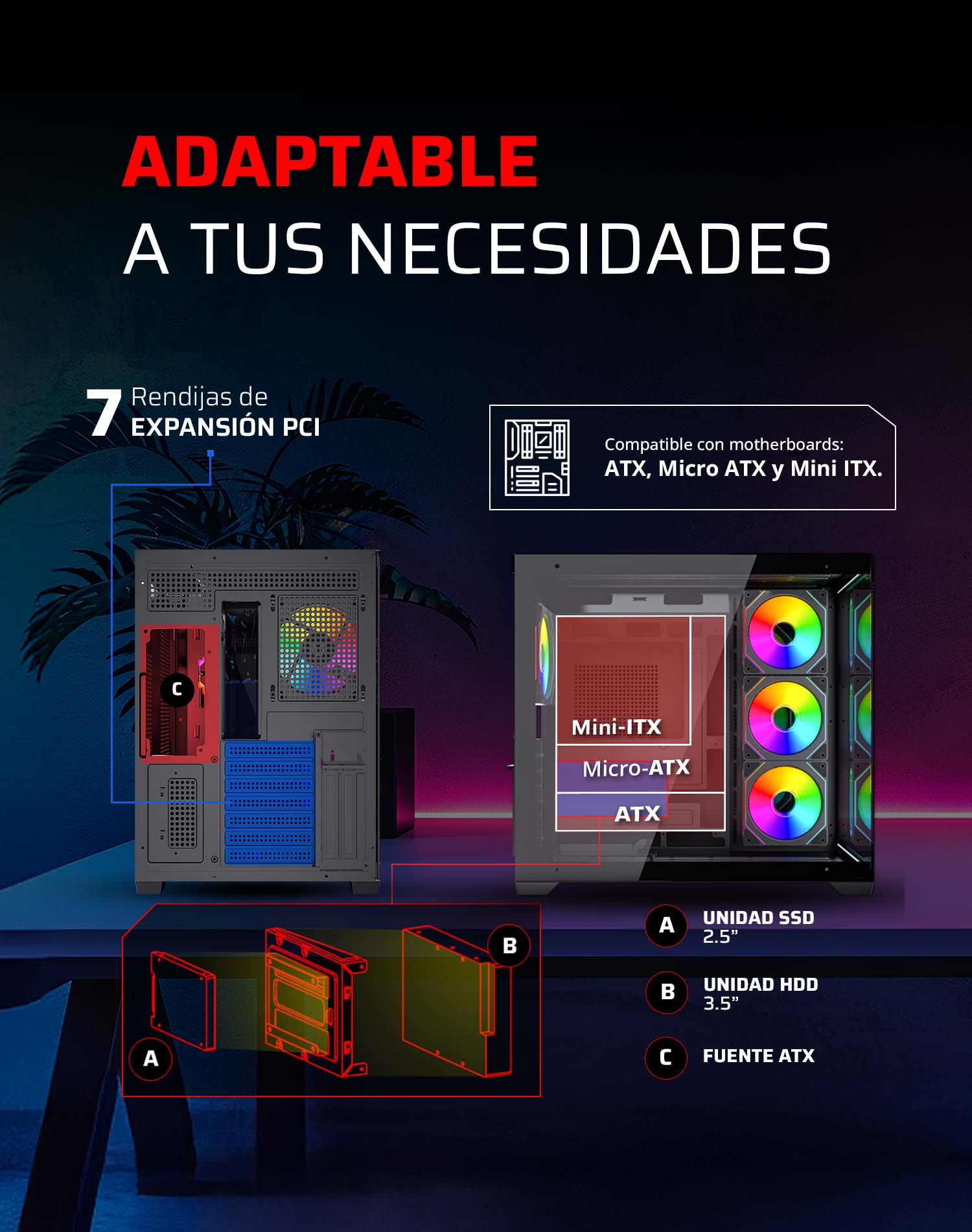 Diseñado para ofrecer una solución completa que combine funcionalidad, compatibilidad y una estructura optimizada para todo tipo de ensamblaje. Compatible con motherboards ATX, Micro ATX y Mini ITX