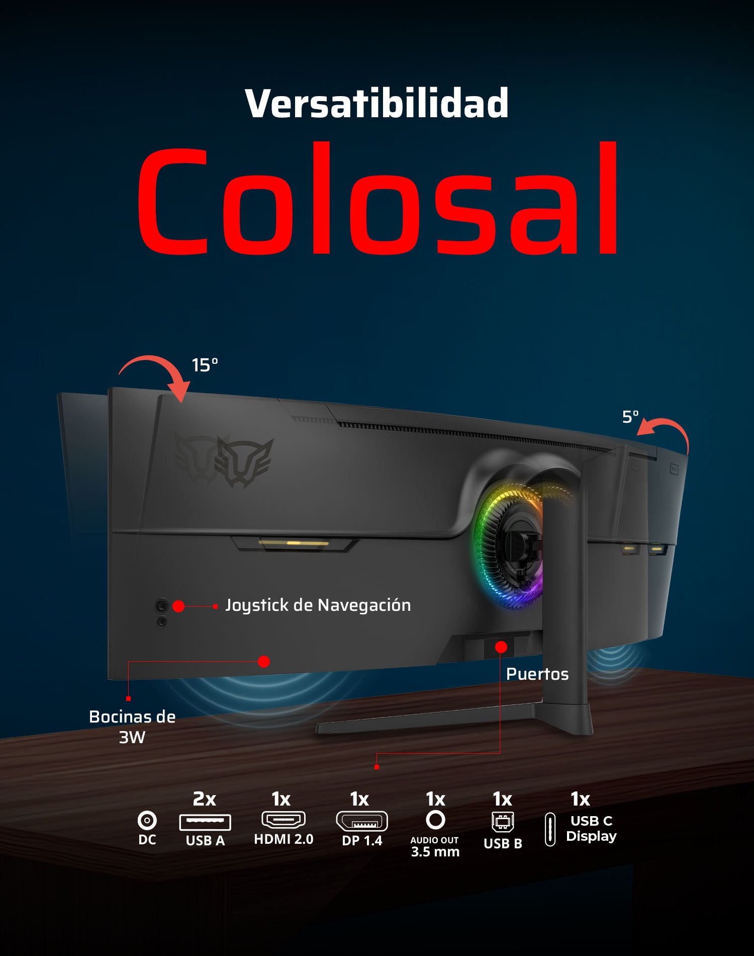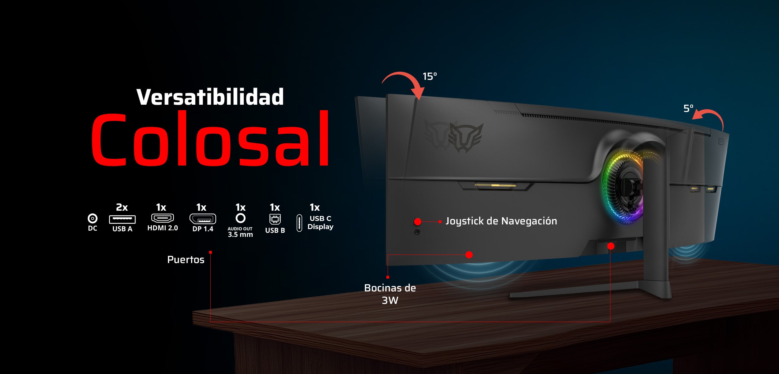Equipa 2 USB-A, 2 HDMI 2.0, 1 USB-C (Display), 2 DisplayPort 1.4 y salida 3.5 mm, ofreciendo conectividad completa y ajuste ergonómico ideal para cada partida.